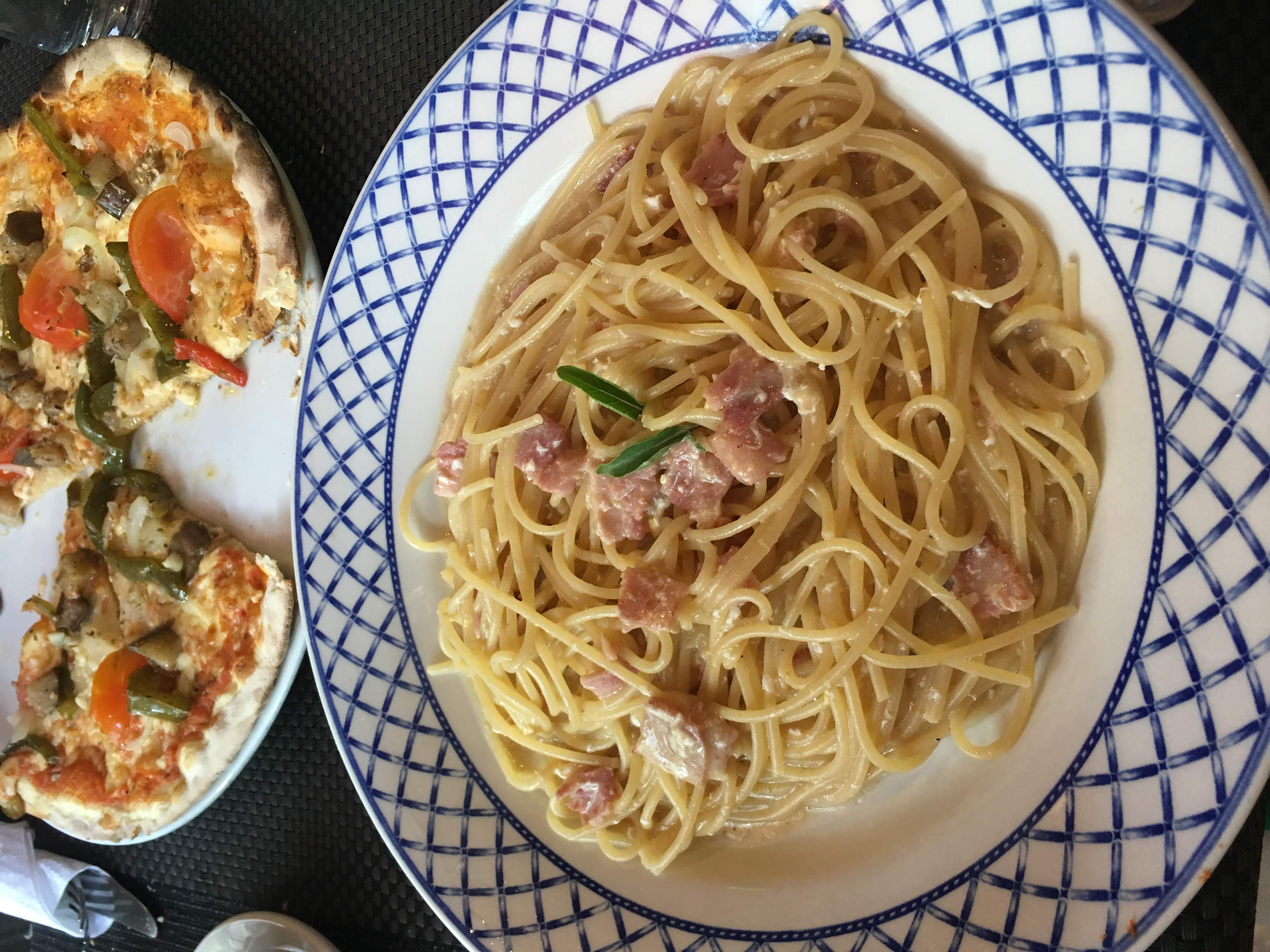 이 식당이 정통 이탈리안인지 궁금하다면 그 집의 까르보나라를 먹어보라는 까르도의 명언이 있습니다. 멕시코에서 워낙 무거운 음식으로 시달린 쑤는 채식기반 피자를 주문했고, 전 원칙대로 정통 까르보나라를 주문했습니다.